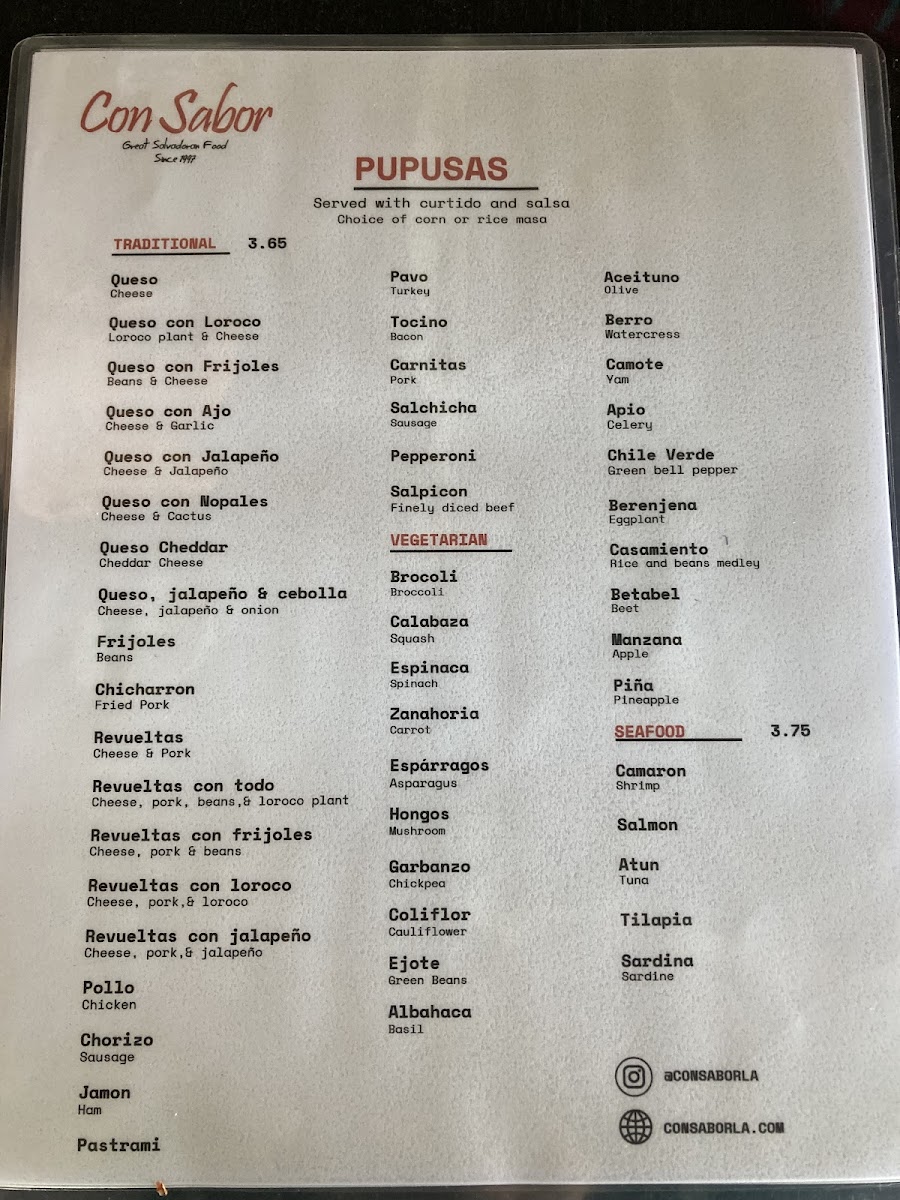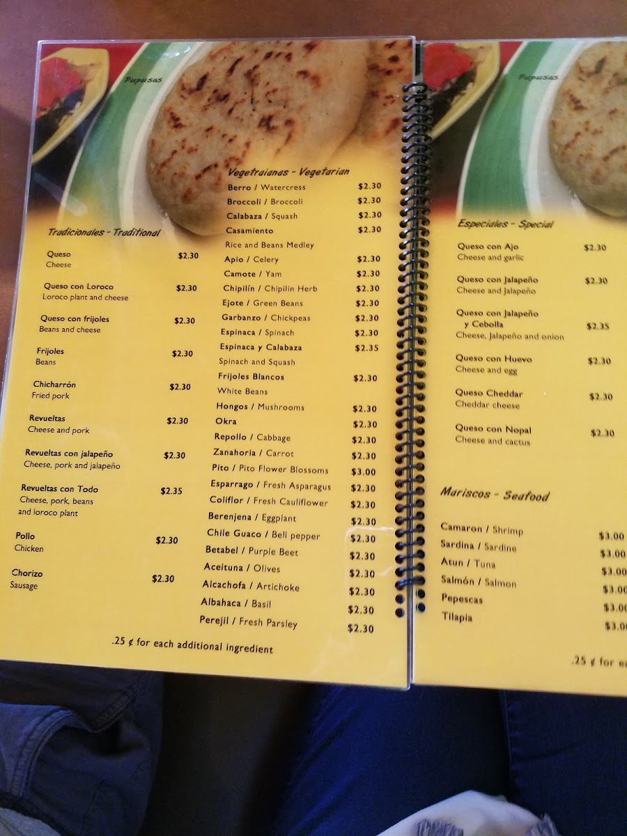 Overall, the menu is suitable for casual dining or quick orders, offering Salvadoran specialties across multiple meal times including breakfast and all-day dining options.